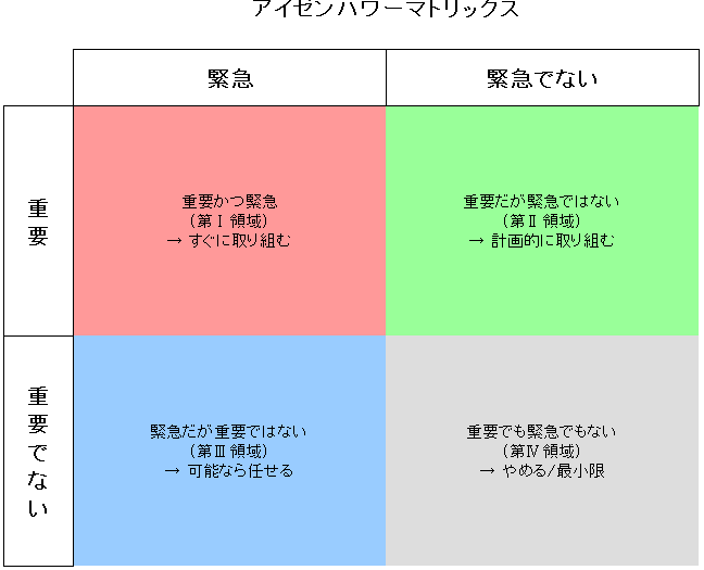 | 第Ⅳ領域 | 重要でも緊急でもない(低効果×低難易度) |
